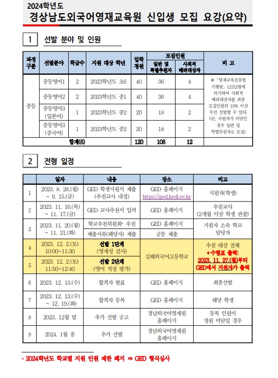 2024학년도 경상남도외국어영재교육원 신입생 선발 계획 안내