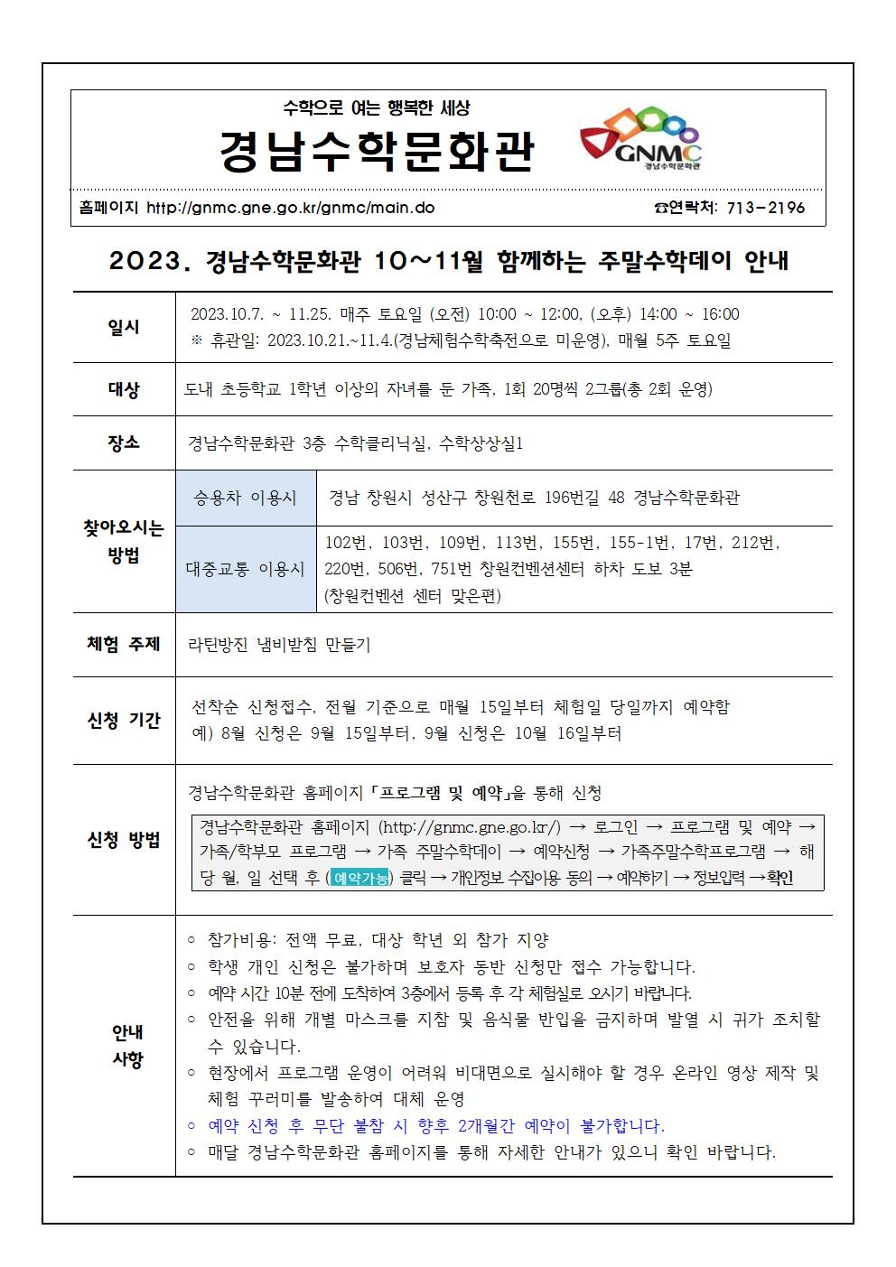 2023. 경남수학문화관 10~11월 함께하는 주말 수학데이 신청 안내