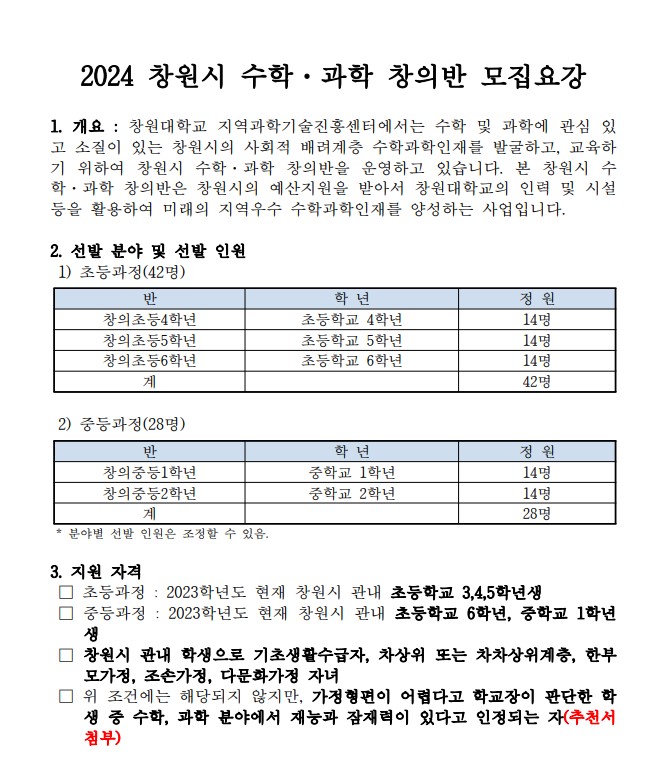 2024학년도 창원시 수학과학 창의반 모집 안내