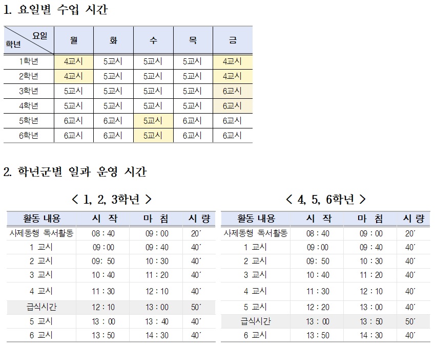 2024학년도 일과운영 및 학년별 수업시간 안내 드립니다.