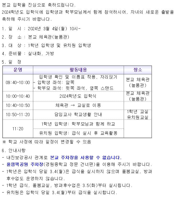 2024학년도 유치원, 초등학교 입학식 안내
