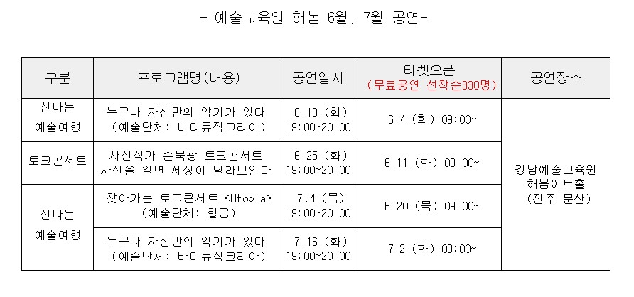 [경남교육청 예술교육원 해봄] 2024. 예술교육원 해봄 토크콘서트 및 공연 안내(6월, 7월)