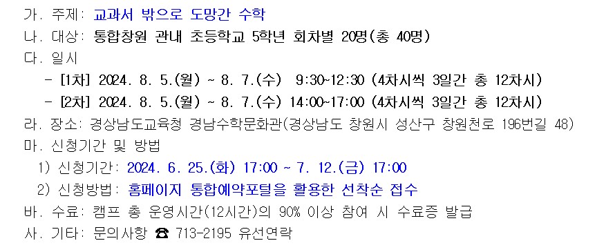 [경남수학문화관] 2024. 경남수학문화관 여름방학 초등 체험수학캠프 일정 안내