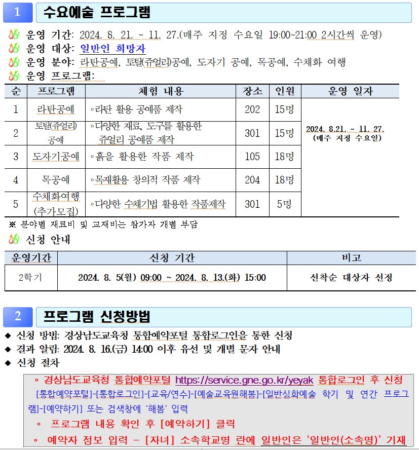 [경남교육청 예술교육원 해봄] 2024. 2학기 일반심화예술 프로그램 신청 안내