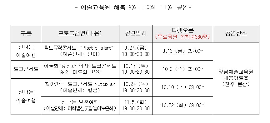 * 신청 방법 : 경상남도교육청 예술교육원해봄(누리집)-해봄아트홀-공연관람- 예약신청