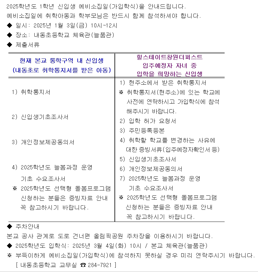 2025학년도 1학년 신입생 예비소집일(가입학식) 안내