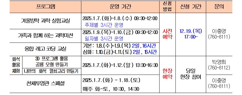 2. 운영 기간 : 2025. 1. 7. (화) ~ 1. 18. (토) * 프로그램별 운영 일자 다름.